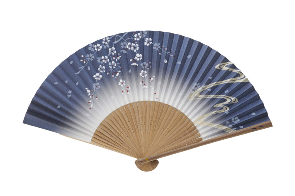 濃紺と白のグラデーションに桜と流水をあしらったお扇子です。