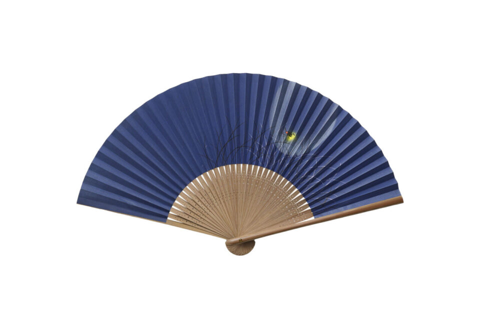深い紺色の夜空に月と重なり淡く光る蛍を描いたお扇子です。