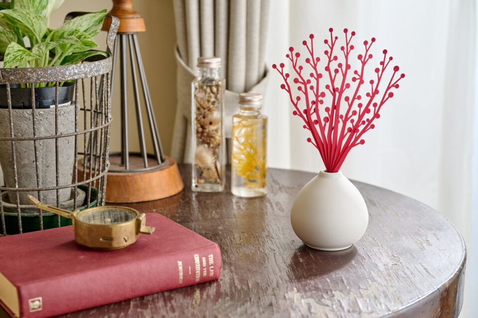 京扇子を扇ぐとふわりと漂う、ほのかな香り。 扇子用に薄く加工された竹は「保香性」に優れ、長く香りを保ち続けるという性質があります。 自然のデザインをモチーフに、扇骨をリードスティックに仕立てました。美濃焼のうつわとともに、お部屋を美しく彩ります。